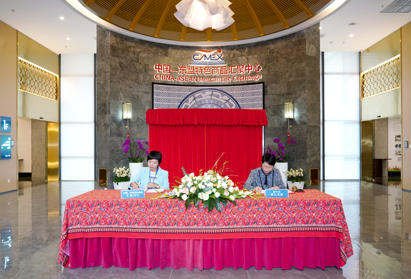 2023年10月10日,匯聚中心又吸引了南寧市第二中學(xué)、南寧市新民中學(xué)學(xué)生綜合實踐研學(xué)基地落戶,并圓滿舉辦了簽約和揭牌儀式。南寧市第二中學(xué)校區(qū)副校長曾晶、南寧市新民中學(xué)副校長關(guān)雪、中國—東盟特色商品匯聚中心副總經(jīng)理盧春梅、中國—東盟特色商品匯聚中心副總經(jīng)理李丹共同出席儀式。