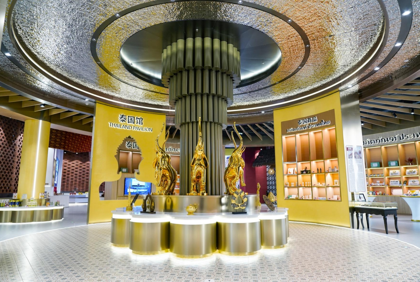 泰國(guó)館展示有多種獨(dú)具“泰味”的精美藝術(shù)品、特色食品、乳膠制品、化妝品、珠寶飾品、手工藝品等特色商品。