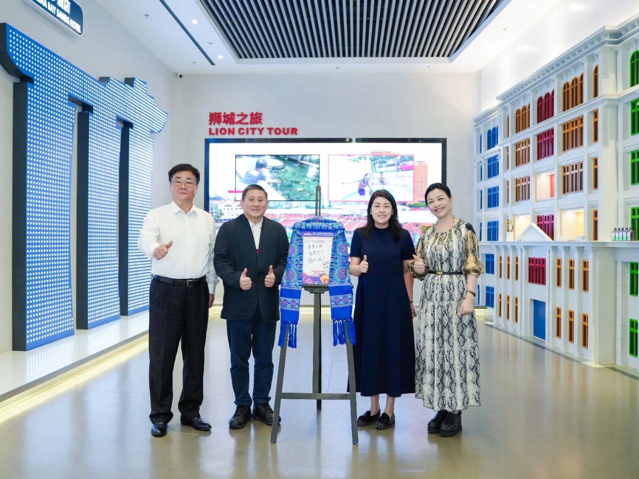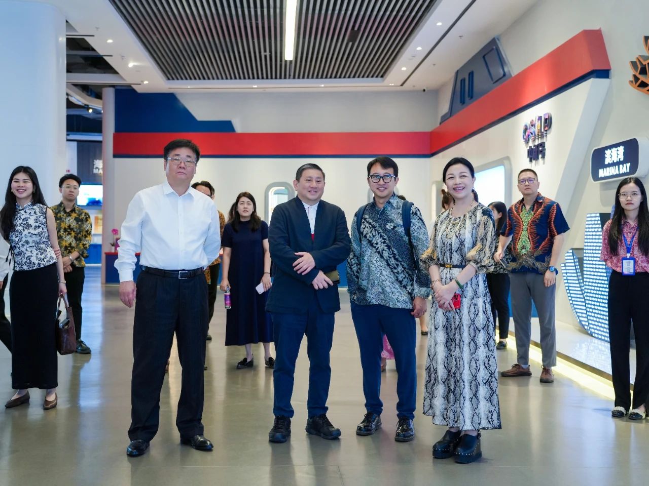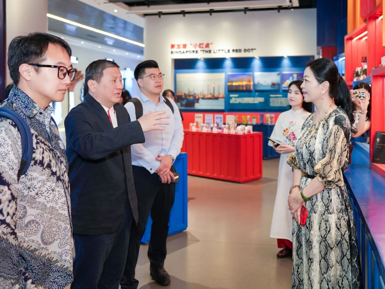 步入?yún)R聚中心,陳海泉大使便被新加坡展館門(mén)口的魚(yú)尾獅所吸引,特意駐足拍攝。進(jìn)入展館后,考察組沉浸式體驗(yàn)了璀璨星空走廊、垂直綠化的花園城市與組屋街區(qū)等場(chǎng)景,紛紛表示很開(kāi)心能在廣西看到一個(gè)多維度呈現(xiàn)“獅城”獨(dú)特風(fēng)貌的地方,漫步其中恍若回到新加坡,倍感親切。同時(shí),考察組充分認(rèn)可了匯聚中心線上線下相結(jié)合的創(chuàng)新理念,并就未來(lái)在經(jīng)貿(mào)、物流等領(lǐng)域的合作與匯聚中心團(tuán)隊(duì)進(jìn)行了交流并達(dá)成共識(shí)。