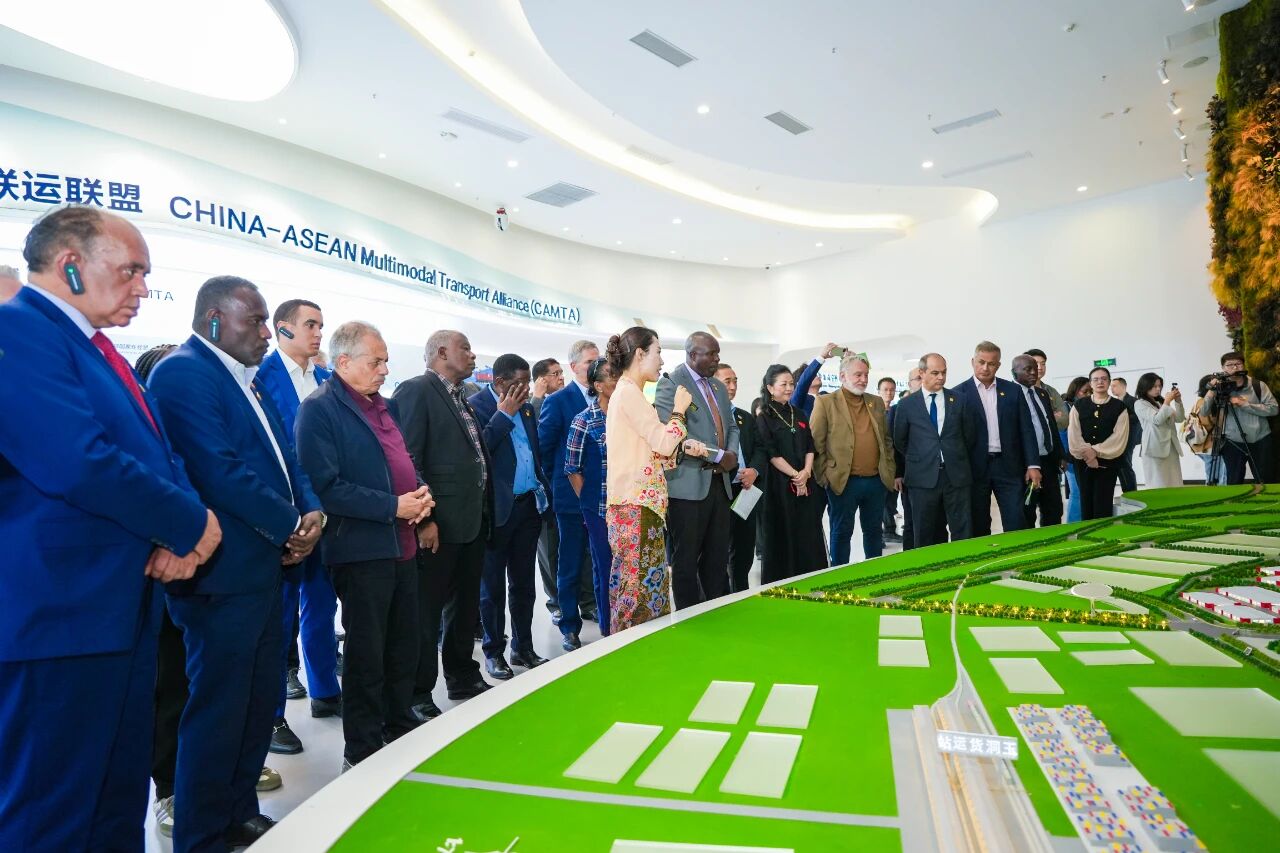 在中新物流園展示中心,駐華使節(jié)代表團通過圖文講解、動態(tài)演示等形式,了解項目的發(fā)展情況,進(jìn)一步對西部陸海新通道的戰(zhàn)略地位與廣西作為通道關(guān)鍵節(jié)點的核心作用有了更深的認(rèn)識。作為廣西參與“一帶一路”及推進(jìn)中國與新加坡互聯(lián)互通、西部陸海新通道建設(shè)的項目之一,中新物流園自啟動建設(shè)以來,展現(xiàn)出蓬勃的發(fā)展活力。園區(qū)通過“以商招商”的模式,目前已引進(jìn)超30家世界500強和中國物流100強龍頭品牌企業(yè)合作入駐,產(chǎn)業(yè)集聚效應(yīng)持續(xù)增強,已形成有別于其他物流園區(qū)的產(chǎn)業(yè)發(fā)展模式。