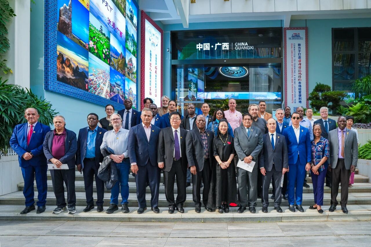 八桂大地,金風(fēng)送爽,碩果飄香。 2025年10月28日,來自阿根廷、克羅地亞、喀麥隆、肯尼亞、約旦、哥倫比亞、韓國等國家的駐華大使及外交官齊聚廣西,開啟為期3天的實地考察之旅,探尋廣西的發(fā)展動能與合作空間。在廣西壯族自治區(qū)外事辦公室黨組成員、副主任宋海軍的陪同下,駐華使節(jié)代表團首站即走進(jìn)中新南寧國際物流園(簡稱“中新物流園”)和中國—東盟特色商品匯聚中心(簡稱“匯聚中心”)。廣西新中產(chǎn)業(yè)投資有限公司、中國—東盟特色商品匯聚中心董事長趙海燕熱情接待駐華使節(jié)代表團。