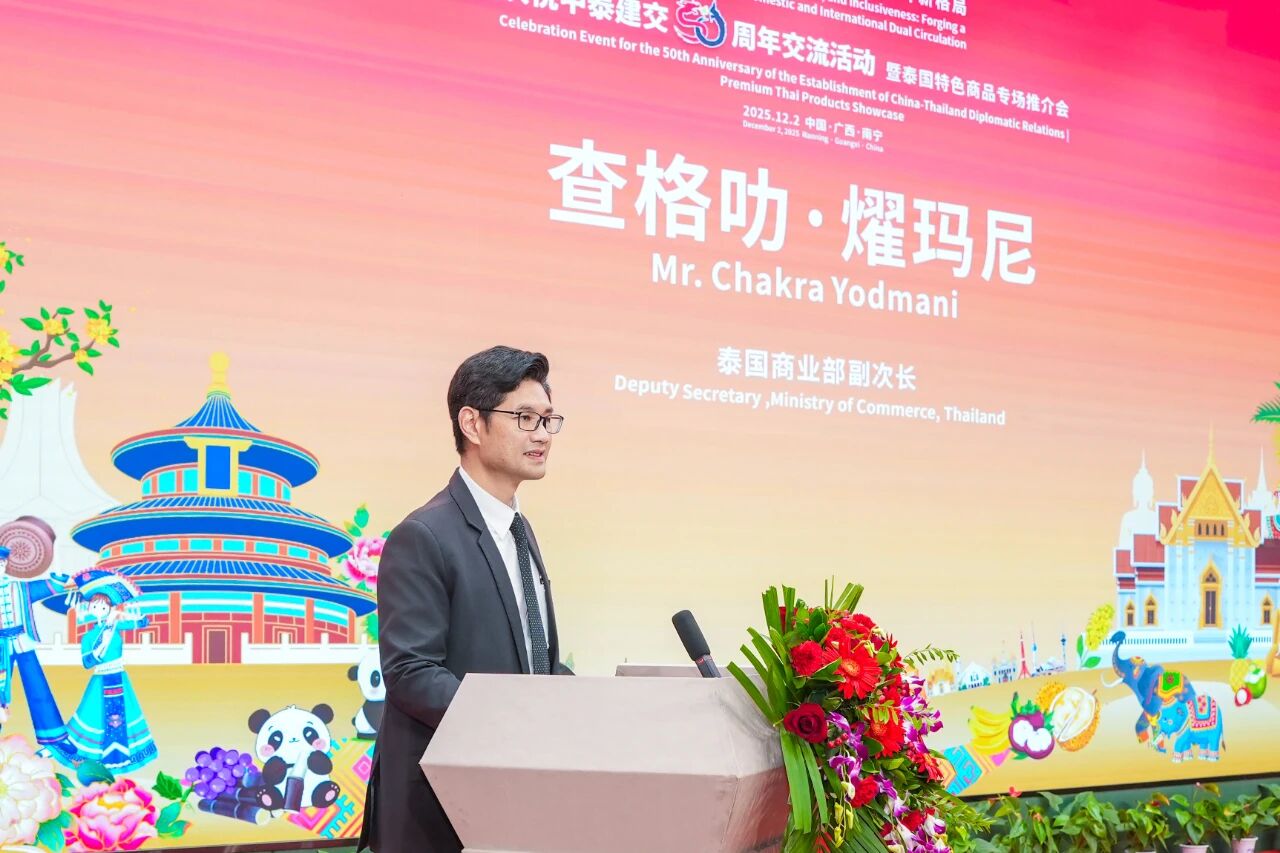 12月2日,“親誠惠容·共拓內(nèi)外貿(mào)雙循環(huán)新格局——慶祝中泰建交50周年交流活動暨泰國特色商品專場推介會”在中國—東盟特色商品匯聚中心隆重舉辦。本次活動由泰國商業(yè)部、泰國商業(yè)部國際貿(mào)易促進(jìn)司、中國國際貿(mào)易促進(jìn)委員會廣西壯族自治區(qū)分會、中國—東盟商務(wù)理事會聯(lián)席秘書處、中國—東盟特色商品匯聚中心(簡稱“匯聚中心”)聯(lián)合主辦,中國國際商會廣西商會、中國檢驗認(rèn)證集團(tuán)廣西有限公司、廣西達(dá)譯科技有限公司、邁越科技股份有限公司、方圓標(biāo)志認(rèn)證集團(tuán)廣西有限公司作為支持單位參與此次活動。